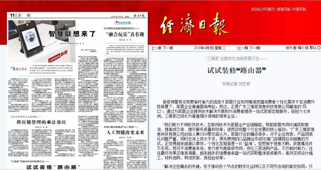“路由器”帶來了實實在在的便利。以有裝修需求的用戶為例,門店設(shè)計人員可以根據(jù)戶型和意向裝修風(fēng)格實時生成3D設(shè)計方案,小到掛鉤拉手、瓷磚地板,大到水暖管線、家具廚衛(wèi),均可按照個性化需求進行品牌選擇和設(shè)計效果渲染。數(shù)據(jù)經(jīng)過整合與拆分后,不同定制信息發(fā)往設(shè)計、生產(chǎn)、物流、裝配等不同環(huán)節(jié),在保證消費者“所見即所得”的同時,也大大提高了后端工廠接單效率。蔡志森介紹,2018年,三維家攜手深圳家具協(xié)會住宅精裝研究院在全國完成了76個項目的138個樣板房施工,在確尺完畢后全部實現(xiàn)7天至15天交付,經(jīng)萬科系統(tǒng)評審一次安裝合格率高達96%。